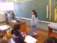 3年英語の時間の様子です。本日は、クリスマスカードを作ります。カードのデザインは、これまで英語で習った色や形を組み合わせて考えていきます。カード作りをする前に、色と形の言い方を復習しました。