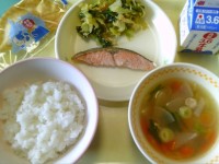 本日は、鰯の蒲焼き、キャベツとツナの炒め物、豚汁、ごはん、牛乳です。
