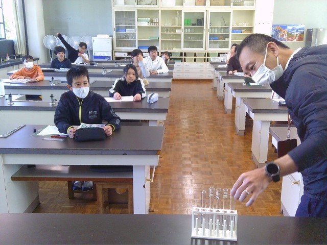 水溶液の性質について学んでいます。無色透明の各種水溶液について、どれが何の水溶液か見分ける方法について考えていくという、中学校の理科につながる内容です。