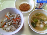 本日は、鶏肉の塩麹揚げ、きゅうりとワカメの酢の物(かつおぶし付)、国清汁、ごはん、牛乳です。