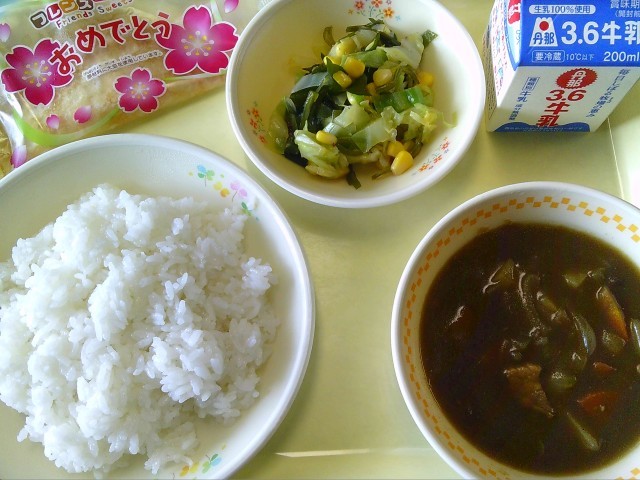ついに第二小最後の給食となってしまいました。本日はカレーライス、海藻サラダ、クレープ、牛乳です。
