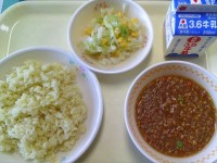 本日の給食は、自校炊飯、牛乳、豆腐ハンバーグ、きのこのソテー、うずら卵のすまし汁でした。