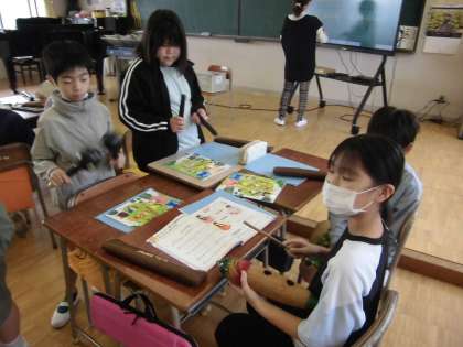 4年生は、「いろんな木の実」の曲に合わせて、マラカスやトライアングルなどの打楽器の演奏をしました。班ごと、曲調に合わせたリズムを考え、練習しました。