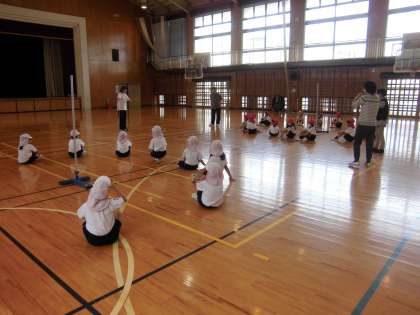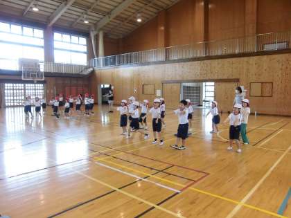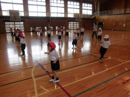 1年生と2年生は、合同で運動会の練習をしました。ダンスの体形から玉入れの体形への移動や全体の動きの確認をしました。