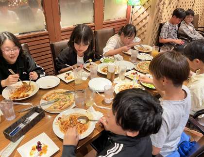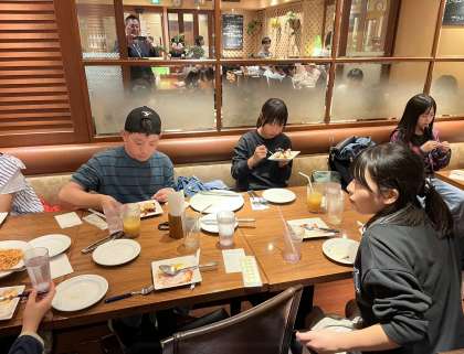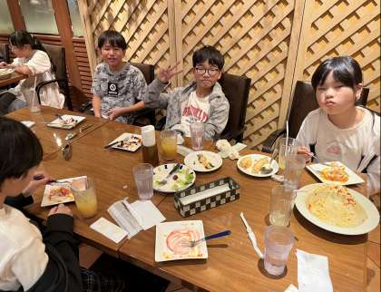第一日目の夕食は、イタリアンです。サラダとピザとトマトソースのパスタでした。オレンジジュースとデザートのケーキもついて、子供達は満足した様子です。
