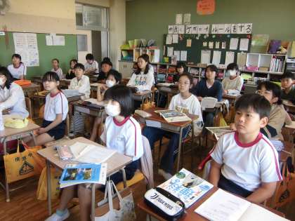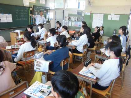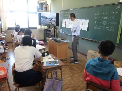 5年生は、流れる水のはたらきの学習で、川の上流と下流での石の大きさや形の違いを動画を見ながら学びました。