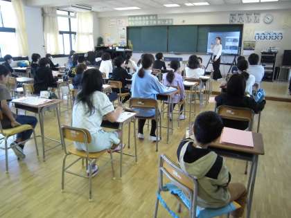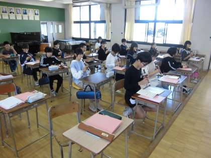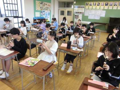 6年生は、「ラバースコンチェルト」をリコーダーで演奏しました。この曲はシに♭が付くヘ長調の曲です。リコーダーで「シ♭」の指使いをしなければならず、少々難易度が高めな曲です。