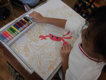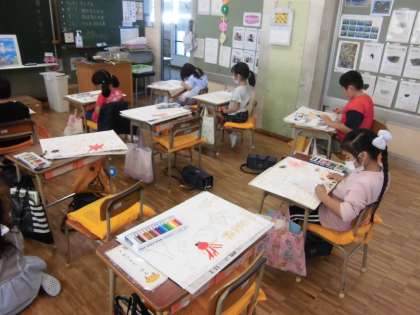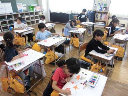 1年生は、お話の絵ということでヤドカリの絵本を読んで(聞いて)、ヤドカリの絵を描きました。海に住むヤドカリやヒトデが絵に登場しますが、これまで見たことがない動物なので、具体的に写真などでヤドカリを知ってから作品作りに取り組みました。