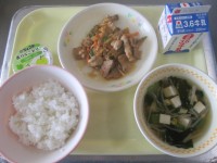 献立は、ご飯、牛乳、ちくわの磯辺揚げ、キャベツときのこの炒め物、豆腐とたまねぎの味噌汁、冷凍みかんでした。