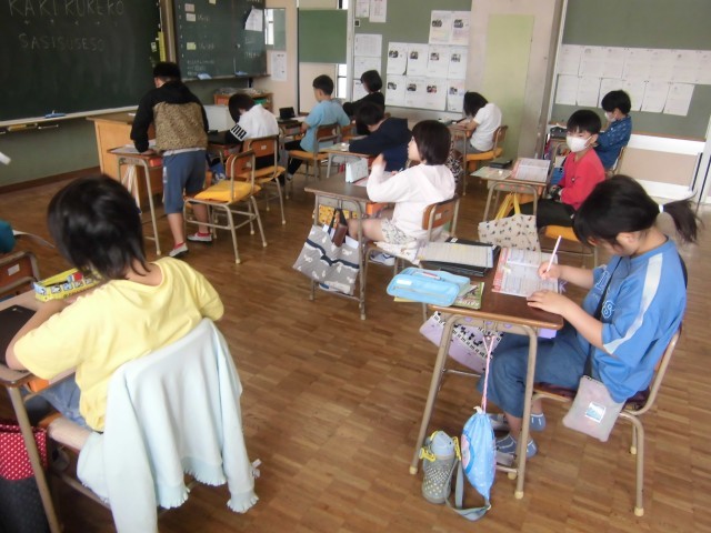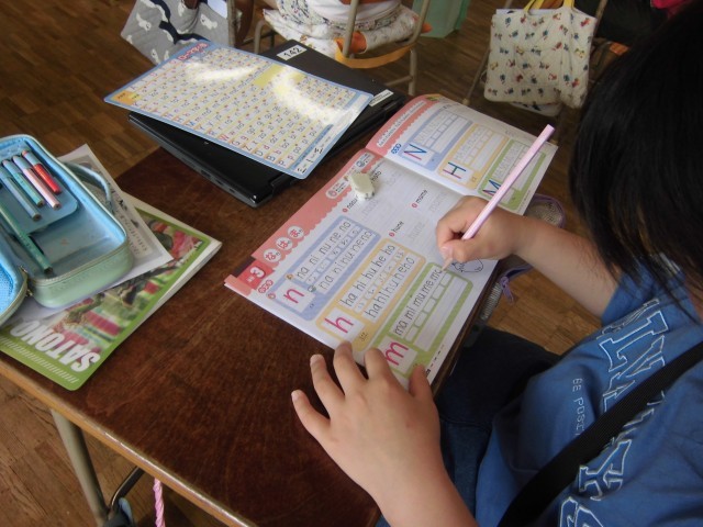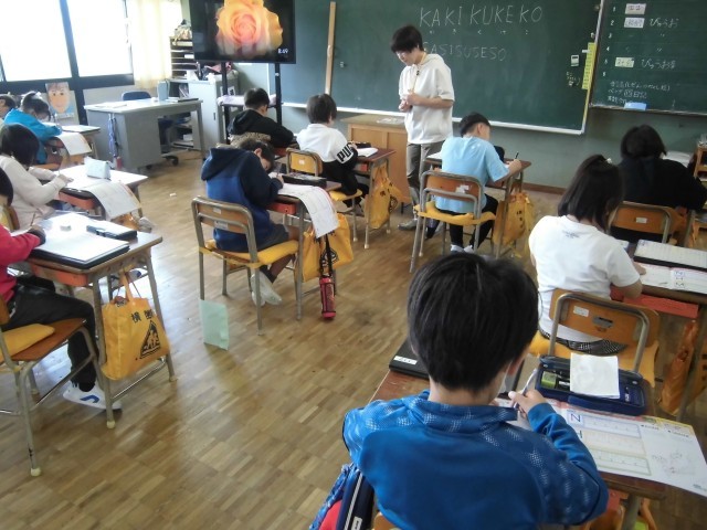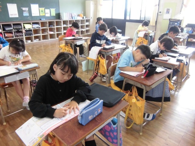 3年生は、ローマ字の学習をしていました。今日は、「N M H」の3つの大文字と小文字、そしてそれらから始まる言葉(単語)を書く練習をしました。