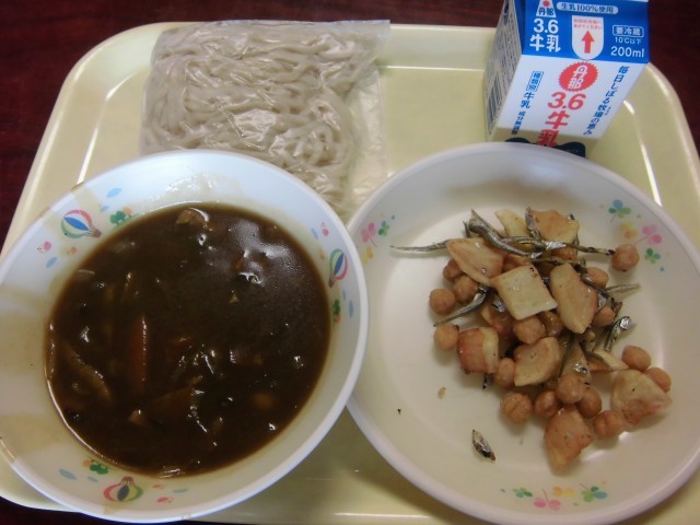 本日の給食は、うどん、牛乳、カレー南蛮、ひよこ豆と小魚の唐揚げでした。麺にしっとり絡むとろみたっぷりなカレーがとてもスパイシーでおいしかったです。