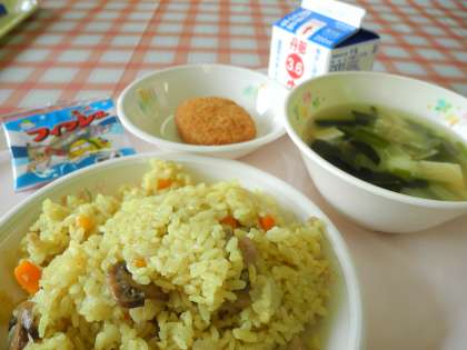 今日の献立は、カレーピラフ、牛乳、だいずコロッケ、ハムとやさいのスープ、アーモンドこざかなでした。カレーピラフがスパイスのいい香りがしておいしかったです。