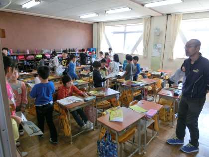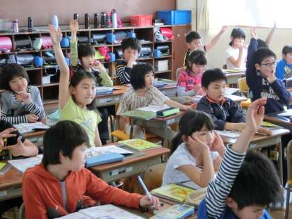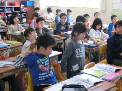 3年生は、算数でかけ算の学習をしています。代表の子が自分の考えた解き方を発表した後、席を移動して、友だちに一生懸命説明をしていました。