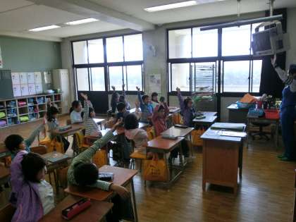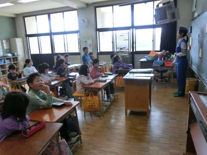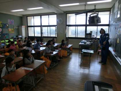 1年生と2年生が、沼津警察署の交通指導員さんをお招きして、交通指導教室を行いました。始めに、各教室で道路の歩き方と渡り方を説明していただきました。
