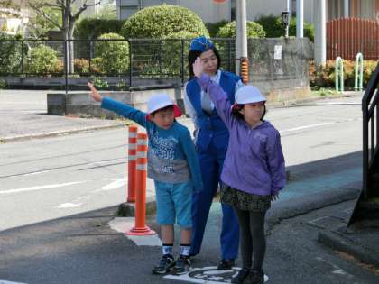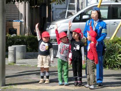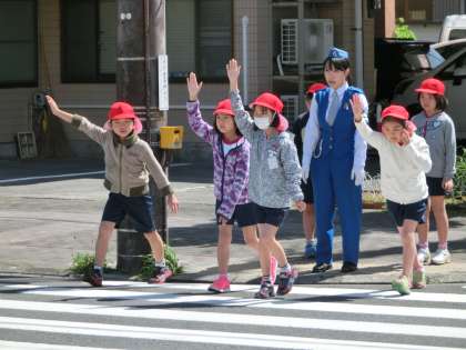 次に、実際に道路に出て、歩き方と渡り方を指導していただきました。2年生は、昨年度もやっているので、とても上手に歩けました。1年生は、いっしょうけんめい安全を確認し、しっかりと手を挙げて、横断歩道を渡っていました。