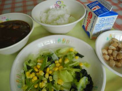 今日の献立は、米飯、牛乳、カレーライス、だいすのからあげ、ほうれんそうとコーンのサラダ、でした。子どもたちの大好きなカレーの日です。給食では、市販のルーを使わずに調理しています。今日のカレーもスパイスと味わいのバランスが絶妙でおいしかったです。