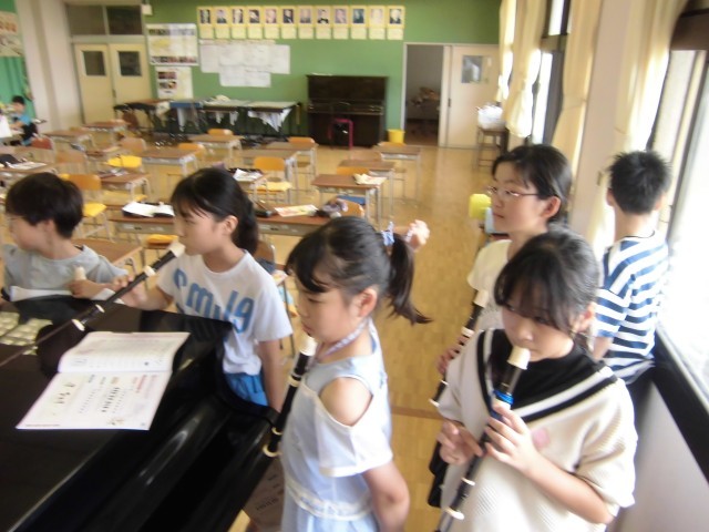 6/27(木)5年生 音楽 公開日 2024/06/27 更新日 2024/06/27 5年生の取り組み 5年生は、リコーダーのテストを行いました。合格した子は、バイオリンに触り音色を楽しみました。 5年生