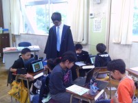 4年生が狩野川放水路見学に出かけました。国土交通省の担当者様に説明を受けています。