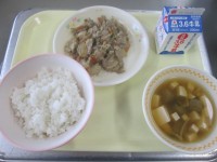 今日の献立は、米飯、牛乳、ホキのカレーあんかけ、ごもくにまめ、ぶたじる、でした。煮豆は大豆や野菜が軟らかく煮られていていました。豚汁は具だくさんでおいしかったです。