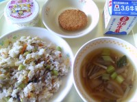 本日の給食は、6年生が家庭科の時間に考えた献立で、ご飯、牛乳、タンドリーチキン、きのこと野菜のソテー、わかめと玉ねぎのみそ汁でした。