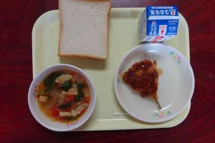 本日の給食メニューは、「ミネストローネ アジフライ 食パン 牛乳」です。本年度初めてのパンです。