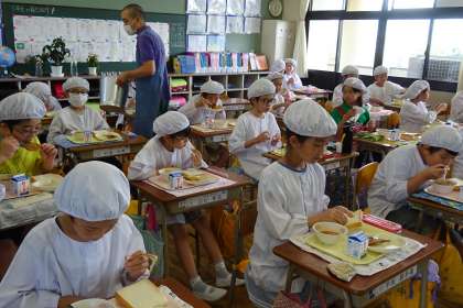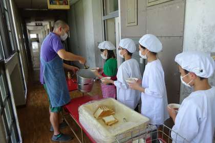 5年生の給食の様子です。教室での配膳は狭いので、廊下で配膳をしています。ミネストローネが少し残ったので、希望する子に先生が分けています。