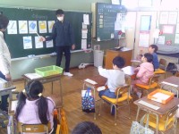 1年、音楽の様子です。本時は、校歌の2番と3番を覚えます。1番については練習しています。歌詞の中には、1,2,3番に共通している歌詞があります。それを歌詞カードの中から探しています。見つかるかな。