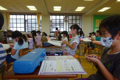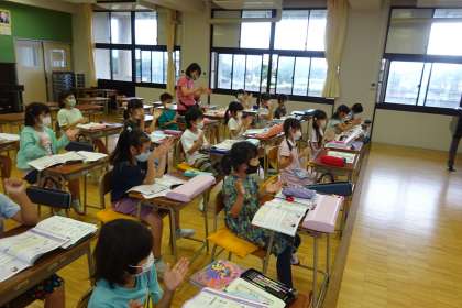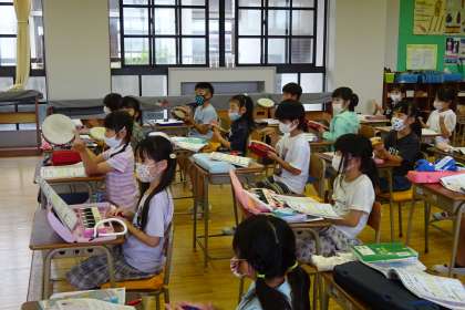2年音楽の授業の様子です。本時は、鍵盤ハーモニカのテストの後、音楽に合わせて、2拍子、3拍子のリズムでたたく活動をしました。