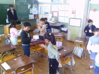 たくさん遊んで学校へ帰ってきました。昼休みはくたびれているかなと思いきや、外で元気に遊んでいた子どもたちです。さっそく大きな葉っぱを見つけてきて、お面を作っていました。