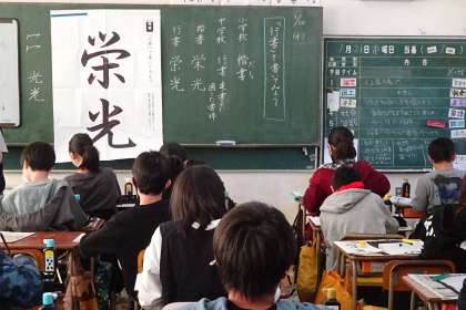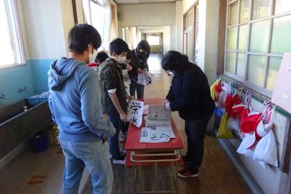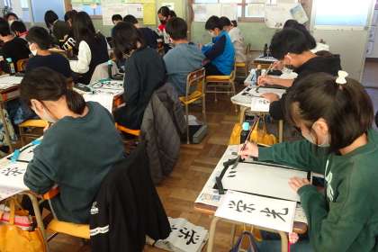 6年書写の様子です。本時は、初めての行書に挑戦です。書き終えると、「なかなかいいなぁ。」「うまくない?」といった声が聞こえてきました。初めての行書で、達筆になったような感想を持っていました。作品を提出する際、先生から「上手だね。」「いいね。」とほめられていました。