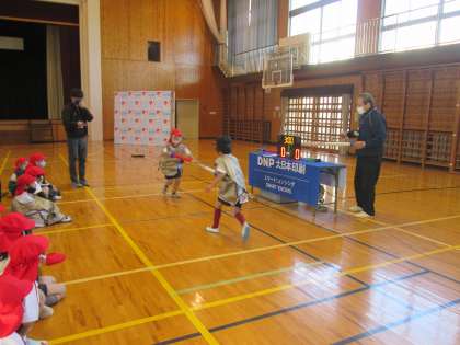 フェンシング競技の映像を見せていただくと、そのかっこよさに歓声を上げる場面もありました。また、実際にセンサーになるベストを着用し、柔らかい素材の剣を持つと、フェンシングの選手になったように構え、突き進んでいく子も見られました。全員が体験している間は、自然と応援する声や拍手も聞かれ、和やかな雰囲気で楽しく過ごせました。
