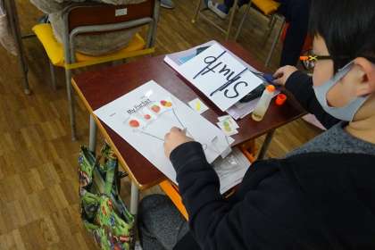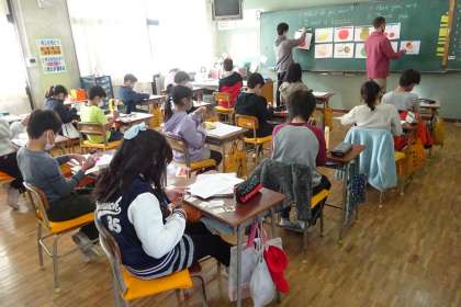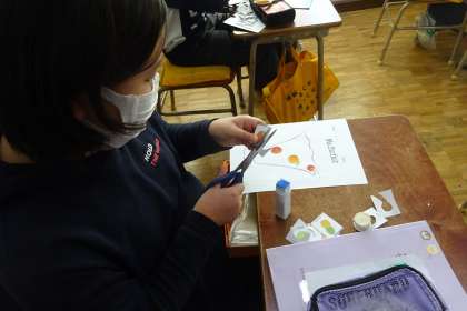 4年英語の時間の様子です。「What do you want?」「Iwant ○○.」を使って交流し、自分の好きなフルーツを集めました。それを使って最後に「My Parfait」を作成しました。フルーツいっぱいのパァフェを想像しながら楽しそうに貼っていました。