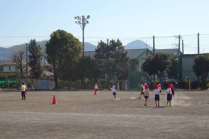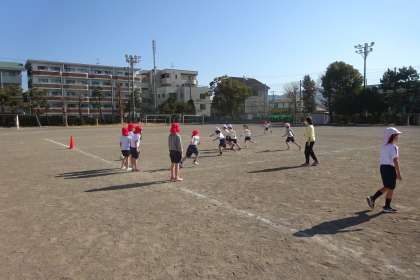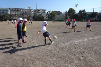 2年体育「ボール蹴りゲーム」の様子です。ボール蹴りゲームとしてキックベースを行っていました。ただ、ルールは特殊で、蹴った子が1塁ベースに着く速さと、ボールをキャッチした子の後ろに守りのメンバーが並ぶ速さで、「セーフ」と「アウト」が決まります。守りの子たちは、ボールに素早く反応し、走って集まっていました。運動量もあり楽しいゲームです。