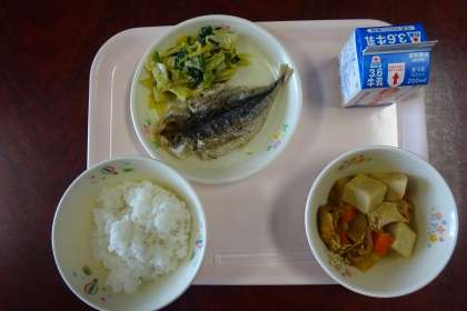 本日の給食メニューは、「アジの干物 ごま和え おけんちゃん 委託米飯 牛乳」でした。本日は、「ふるさと給食」ということで、食材全てが静岡県産です。中でもアジ、大中寺いも、ほうれん草は、沼津産でした。おけんちゃんに入った大中寺いもは、煮崩れせずほくほくとしていておいしかったです。
