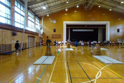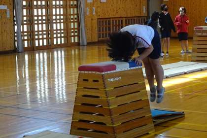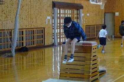 6年体育「跳び箱運動」の様子です。自分の目標に合わせて、開脚跳びやかかえ込み跳び、台上前転などを練習方法を考えながら練習していました。