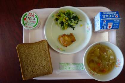 本日の給食メニューは、「鶏肉のスイートチリソース焼き ほうれん草とコーンのソテー 野菜スープ 黒糖角型食パン 牛乳」野菜たっぷりのメニューでした。