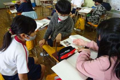 4年国語「さわっておどろく」の様子です。説明文教材の学習です。筆者の経験と考え方について表にまとめていました。全体で話し合い前に、前後の友達で意見の交換をしました。