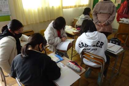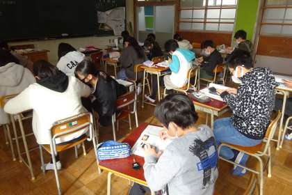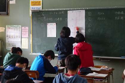 6年算数少人数指導「データの活用」の様子です。日本52都市の1世帯のぎょうざに使う金額について、度数分布表からグラフに表し、平均値を求めていました。今回のデータでは静岡県の浜松市が宇都宮市をおさえて1番でした。