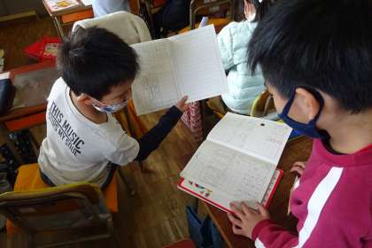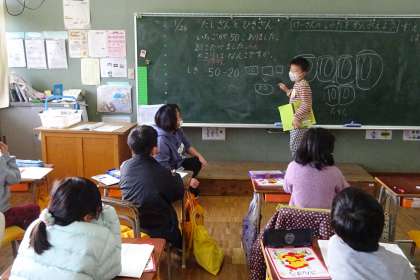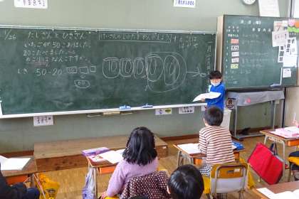 1年算数「たしざんとひきざん」の様子です。「50個あったイチゴを20個たべると、のこりはいくつか」という問題を解いていました。これを図やことばを使って説明します。それぞれノートに説明用の図を描き、隣同士で説明し合った後、全体で確認していきました。