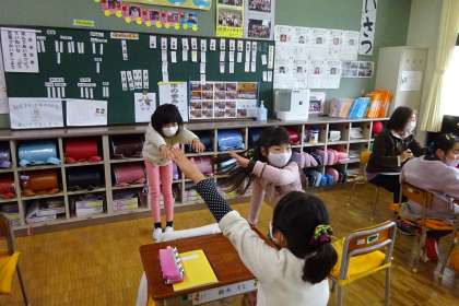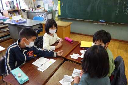2年国語「やってごらん おもしろいよ」の様子です。1年生とのあそび大会でやる内容が決まりました。半分が1年生役となり、あそび大会のリハーサルをやりました。