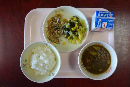 本日の給食メニューは、「カレーライス 大豆のボリボリ揚げ 海藻サラダ 自校米飯 牛乳」でした。