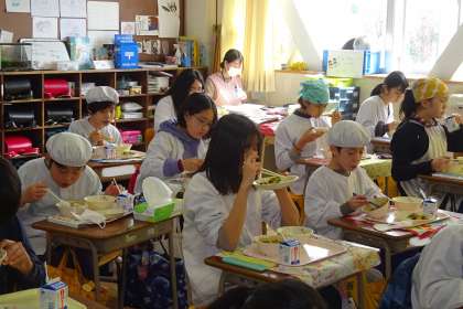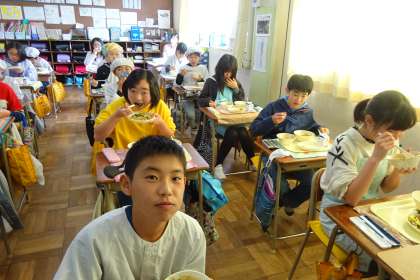 おいしそうに食べる6年生の様子です。この後、奉仕作業を行うのでたくさん食べて、力をつけています。