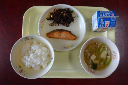 本日の献立は、「塩鮭 ひじきと大豆の炒め煮 豆腐とキャベツの味噌汁 自校米飯 牛乳」でした。本日は、和食。昨日、一昨日と残食がほとんどなく、給食室のみなさんがとても喜んでいました。