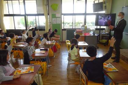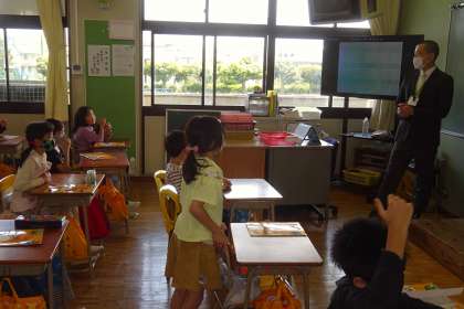 2年授業参観の様子です。言語科読解「学校たんけんはまかせて!」について授業をしました。今年は、1年生に学校のことを教えてあげる番です。紹介カードを作る前に、先生が作った学校の様子についてのクイズを行いました。