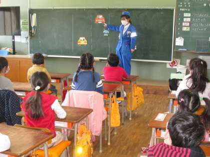 本日、1,2年生を対象に、交通安全教室を実施しました。交通安全協会の3名の交通安全指導員さんに指導していただきました。最初に教室で交通安全知識を確認する学習をし、その後学校の周辺を2〜3人のグループになって実際に歩く練習をしました。
