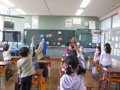 本日、1,2年生を対象に、交通安全教室を実施しました。交通安全協会の3名の交通安全指導員さんに指導していただきました。最初に教室で交通安全知識を確認する学習をし、その後学校の周辺を2〜3人のグループになって実際に歩く練習をしました。