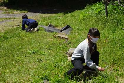 3年理科の様子です。校庭のいろいろな生き物の観察をしていました。植物や昆虫などを探し、色・形・大きさを記録していました。