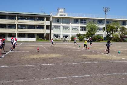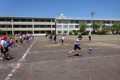 5年体育の様子です。ボールを使って、体つくり運動をしていました。自分が転がしたボールを拾いながらのダッシュ、仲間が転がしたボールを拾いながらのダッシュなど、ボールを使ったダッシュを行った後、ペアになってキャッチボールなどをして投力を高める活動を行いました。いろいろな動きを楽しそうに挑戦していました。