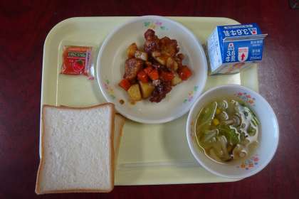 本日の献立は、「鶏肉とジャガイモの揚げ煮 春キャベツスープ イチゴジャム 食パン 牛乳」でした。
