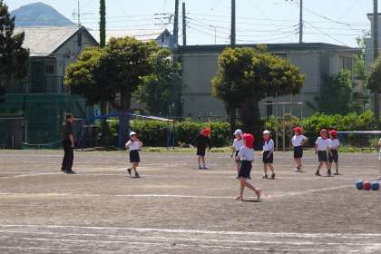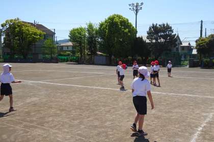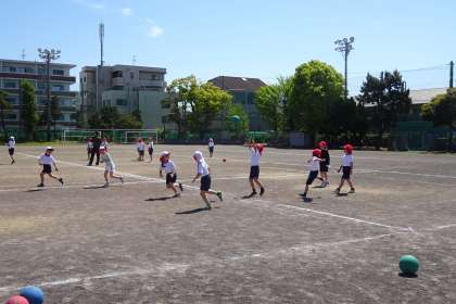 ボールを使って投げたり、キャッチしたりする練習を行った後、4チームに分かれて、ドッジボールをしました。